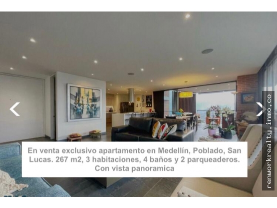 Pesos ColombianosVenta de Espectacular Apartamento en Poblado San Lucas â Elegancia y Comodidad en Cada Espacio Este hermoso apartamento, ubicado en una de las mejores zonas residenciales de MedellÃn, ofrece 267 m² de lujo, comodidad y estilo de vida exclusivo. Diseñado para quienes valoran la privacidad, la funcionalidad y el acceso a las mejores comodidades, este inmueble es una verdadera joya. â¢Â 267 m²  ⢠3 Habitaciones  ⢠4 Baños  ⢠2 Parqueaderos Valor: $ 2.600.000.000 ¡Haz realidad el sueño de vivir en uno de los lugares más cotizados de MedellÃn! Contáctanos para obtener más información y agendar una visita. Con nuestra asesorÃa personalizada, tu compra será fácil, rápida y segura.