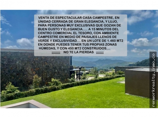 Pesos ColombianosVenta de espectacular casa campestre de lujo a 15 minutos del poblado, cerca de Medellin, en sector super campestre antes del peaje, unidad cerrada llena lujo simplemente es una .... luxury home, arquitectura moderna. Ãste es un lugar donde la exclusividad y la naturaleza se unen a través de nuestra arquitectura de alto nivel. espacios con acabados de lujo y exclusivos. Ubicado en el Alto de Las Palmas, con fácil acceso por la vÃa principal de la Avenida Las Palmas. Con zonas comunes exclusivas como sauna, turco, jacuzzi, billar, gimnasio ,chimenea, Wellness SPA, Club House, Salón Lounge Múltiple , zonas diseñadas con detalles de lujo. Una casa en medio de mucha naturaleza, tranquilidad y acabados  espectaculares,  de lujo que resaltarán su estilo de vida. 1.644 m2 lote 369 m2 casa más 25.11 m2 de pérgola estadero más 48.44 m2 de parqueaderos . Total  aproximado  443 mt2 3 alcobas más posible cuarta alcoba Y-O oficina . Alcobas con Vestier y baño Alcoba de empleada completa Administración mes  $ 660.000 Predial $3.125.000 trimestral  Valor $ 5.300 cinco mil trecientos millones de pesos colombianos valor en dolares us $ 1.325.000 un millon trecientos veinticinco mil dolares Cerca de Viva Palmas, Indiana, Columbus School , Variante Aeropuerto a tan solo 15 minutos del centro comercial el tesoro y todos los servicios en medellin el poblado. Si este es tu presupuesto , si te interesa esta propiedad y llena tus expectativas de inversión, No dejes pasar la oportunidad, no dudes en llamarme para que vamos a conocer esta excelente opción de inversión, y ésta belleza de propiedad . Con nuestros servicios, y con nuestra asesorÃa personalizada durante todo el proceso, compras fácil, rápido y seguro, esperamos tu llamada. English Spectacular country house for sale near Medellin, in the super country sector before the toll, closed unit full of luxury, it is simply a... luxury home This is a place where exclusivity and nature come together through our high-level architecture. spaces with luxury and exclusive finishes. Located in Alto de Las Palmas, with easy access along the main road of Avenida Las Palmas. With exclusive common areas such as sauna, Turkish, jacuzzi, billiards, gym, fireplace, Wellness SPA, Club House, Multiple Lounge, areas designed with luxury details. A house in the middle of lots of nature, tranquility and spectacular, luxury finishes that will highlight your lifestyle. 1,644 m2 lot 369 m2 house plus 25.11 m2 of pergola and 48.44 m2 of parking spaces. Approximate total 443 m2 3 bedrooms plus possible fourth bedroom AND-OR office. Bedrooms with dressing room and bathroom Complete maid's bedroom Monthly administration $660,000 Property $3,125,000 quarterly Value $5,300 five thousand three hundred million Colombian pesos value in dollars US $ 1,325,000 one million three hundred and twenty-five thousand dollars Close to Viva Palmas, Indiana, Columbus School, Variante Aeropuerto, just 15 minutes from the El Tesoro shopping center and all the services in Medellin, the town. If this is your budget, if you are interested in this property and it meets your investment expectations, do not miss the opportunity, do not hesitate to call me so that we can get to know this excellent investment option, and this beauty of property. With our services, and with our personalized advice throughout the entire process, purchasing is easy, fast and safe, we look forward to your call.